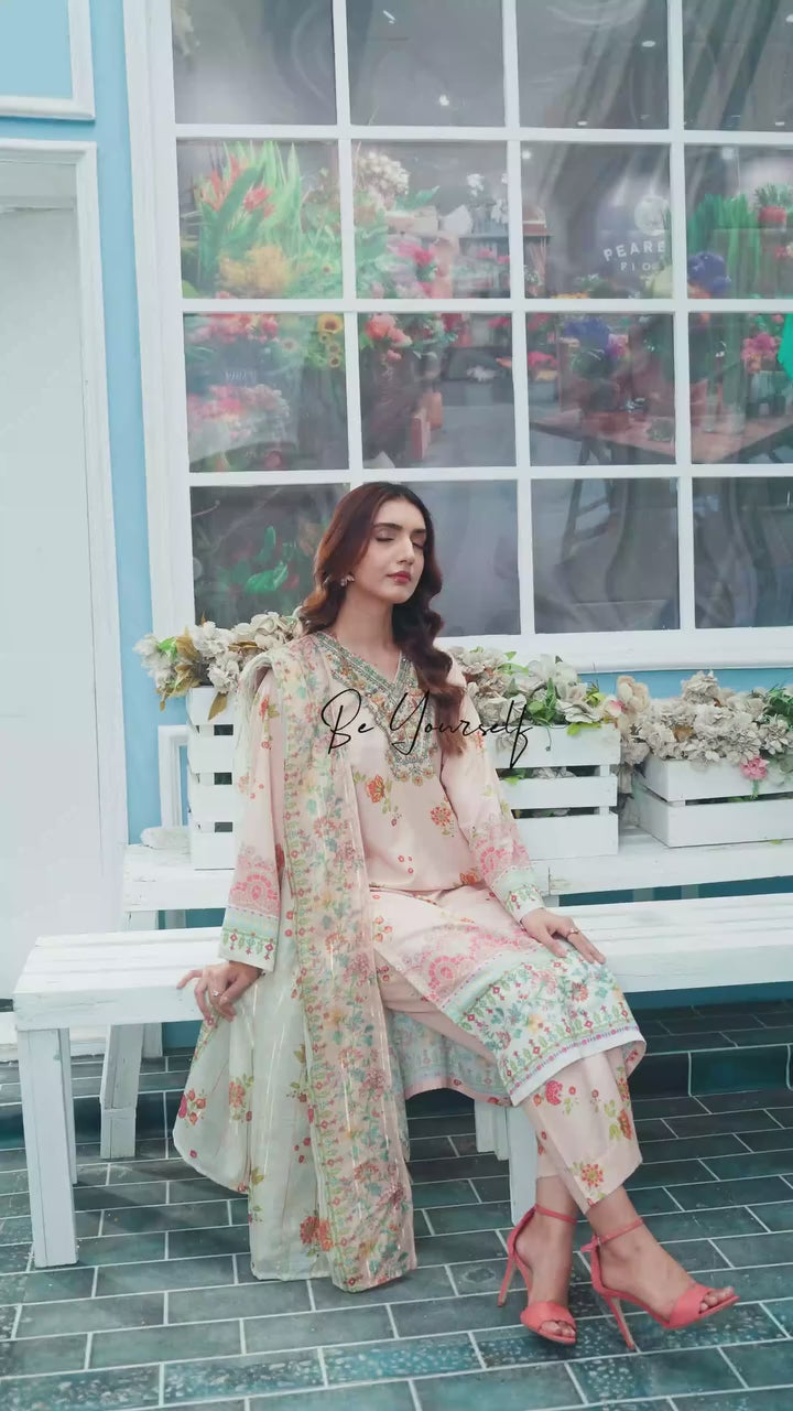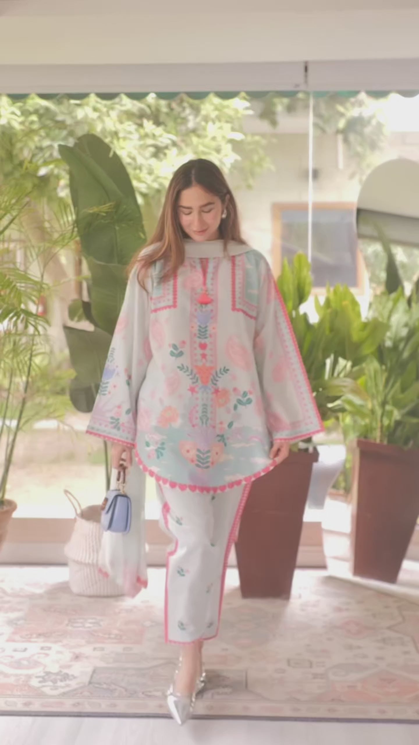 Elegant Three-Piece Ensemble featuring a long, digitally printed lawn kurta in a refreshing palette of light blue, white, mustard, and indigo with intricate traditional motifs. Paired with a matching printed...