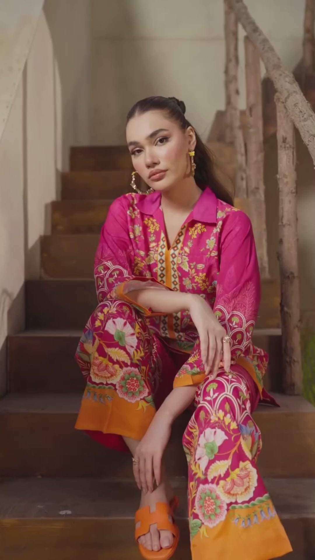 Bright pink kurta set with dupatta, highlighted by tropical motifs in bold orange, yellow, and fuchsia tones. Featuring a relaxed silhouette, statement sleeves, and wide-leg pants, it pairs with a...