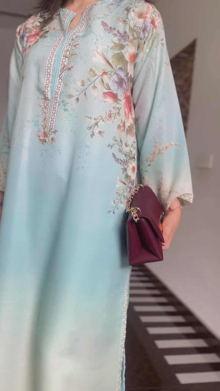 Presenting Sea Green Pearl Co-ord Set: Serene elegance with the turquoise ombré kurta set, adorned with delicate floral prints and intricate neckline detailing. Crafted from a lightweight, flowy fabric, this ensemble...