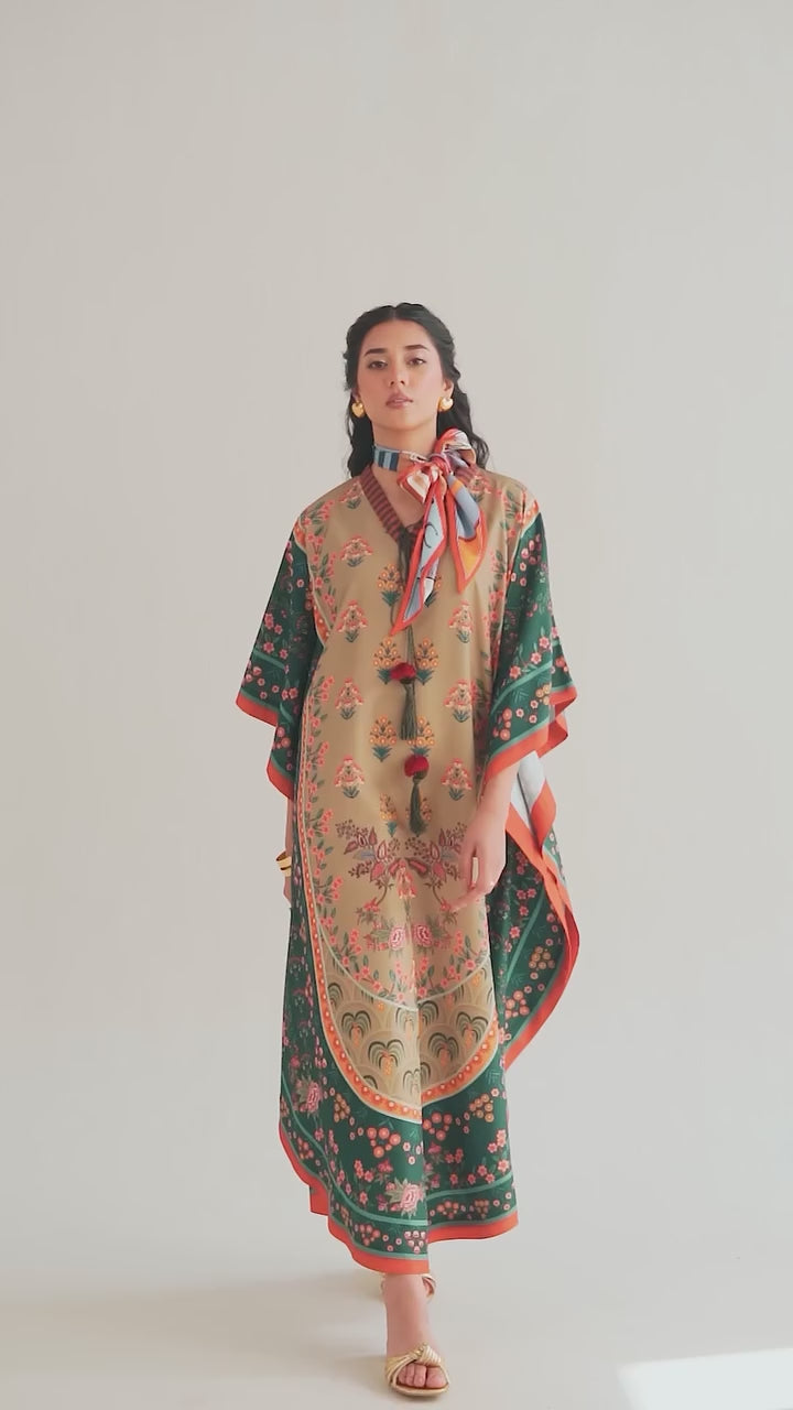 Elevate Your Style With This Elegant Floral Kaftan, Crafted In A Soft Beige Base Adorned With Vibrant Multicolor Botanical Prints. Featuring Wide Sleeves With Intricate Detailing And A Relaxed Silhouette,...