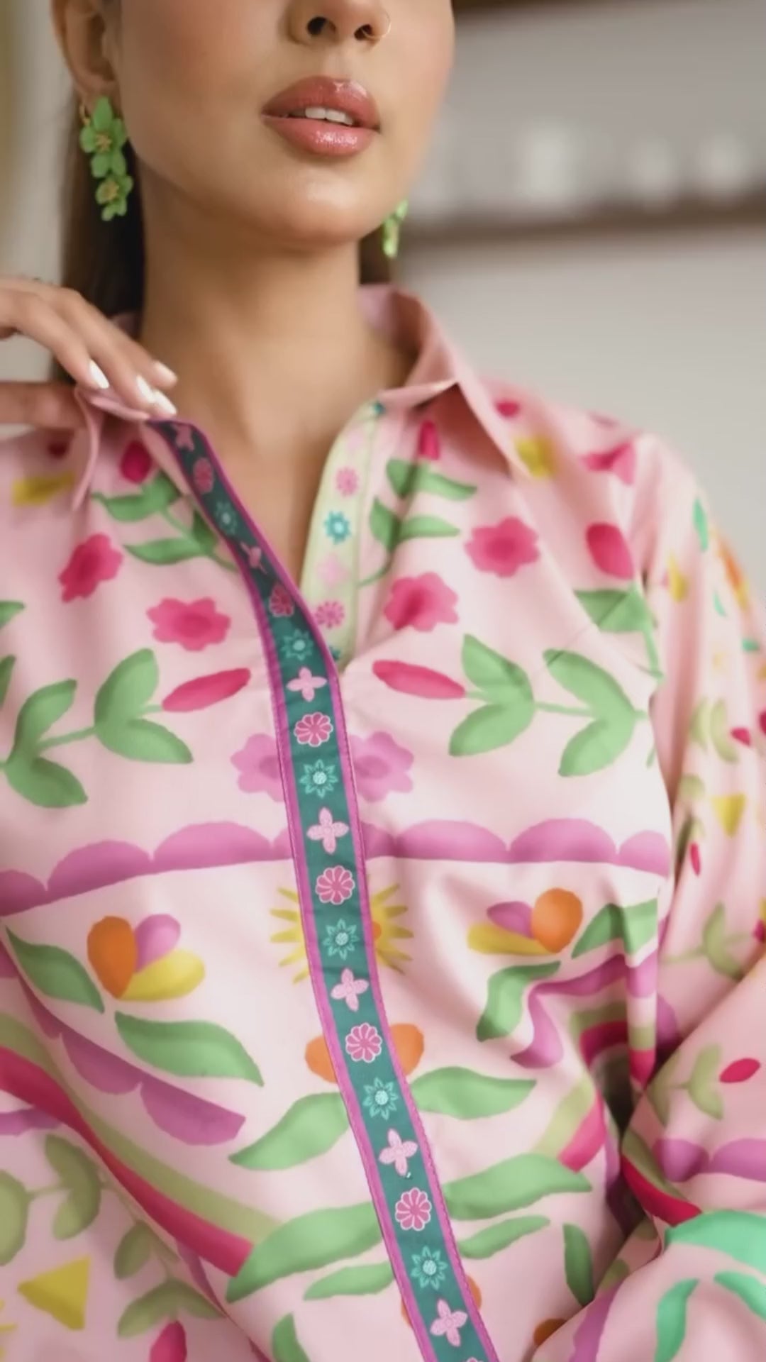 Elegant And Effortless, This Printed Cord Set Features A Soft Cream Base Adorned With Vibrant Botanical Motifs And Geometric Borders. Paired With Statement Trousers And A Pop Of Pink, It's...