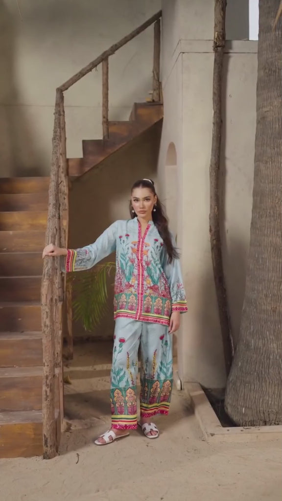 A Charming Ensemble That Effortlessly Blends Tradition With Modernity. Crafted From Lightweight Fabric, This Two-Piece Set Features A Serene Sky-Blue Base Adorned With Intricate Floral And Botanical Prints In Vibrant Hues. The Straight-Cut Trousers And Co-Ordinating Tunic Are Framed By Bold, Contrasting Borders In Deep Pinks And Greens