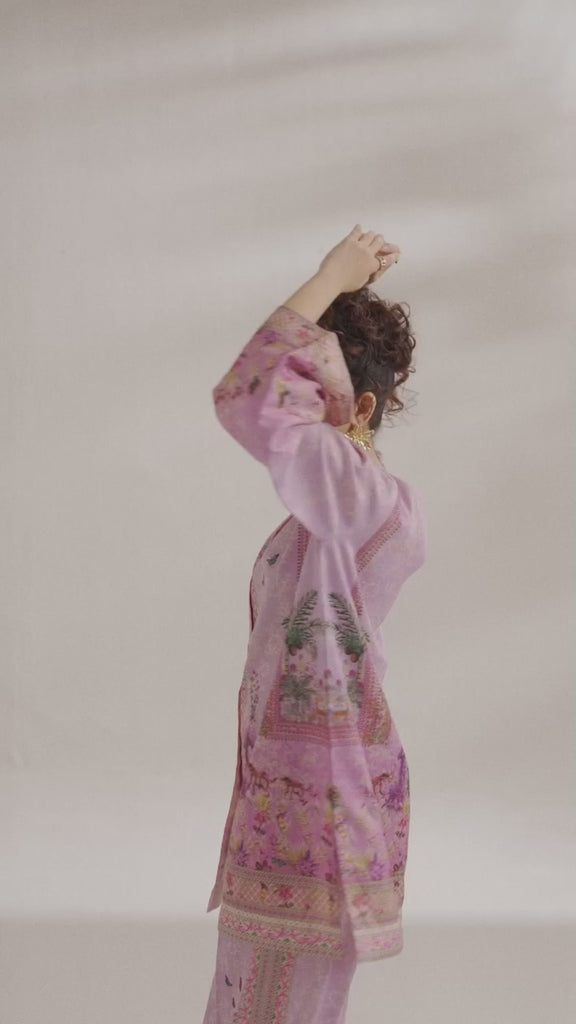 Introducing The Lilac Dreams Cord Set. This Elegant Two-Piece Ensemble Features A Long, V-Neck Tunic And Matching Straight Trousers, Both Adorned With A Lush, Digital Print Of Whimsical Landscapes, Butterflies, And Floral Motifs In Shades Of Lilac, Lavender, And Pink. The Tunic Is Finished With A Delicate Pink Piping Along The Placket