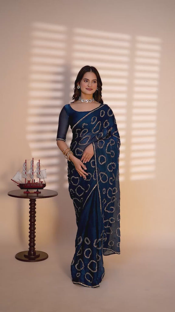 Drape yourself in elegance with this Dark Blue Sea Colour, showcasing a beautiful Circle Pattern, intricately detailed with sparkling Jarkan Stone Work. The sheer elegance of the fabric combined with the sparkling embellishments ensures a truly glamorous look