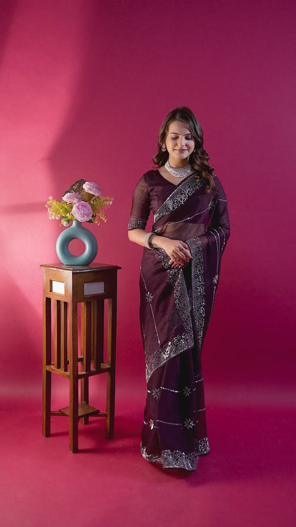 Drape yourself in elegance with this Wine Red Colour, showcasing a beautiful Lehriya Pattern, intricately detailed with sparkling Swarovski work. The sheer elegance of the fabric combined with the sparkling embellishments ensures a truly glamorous look