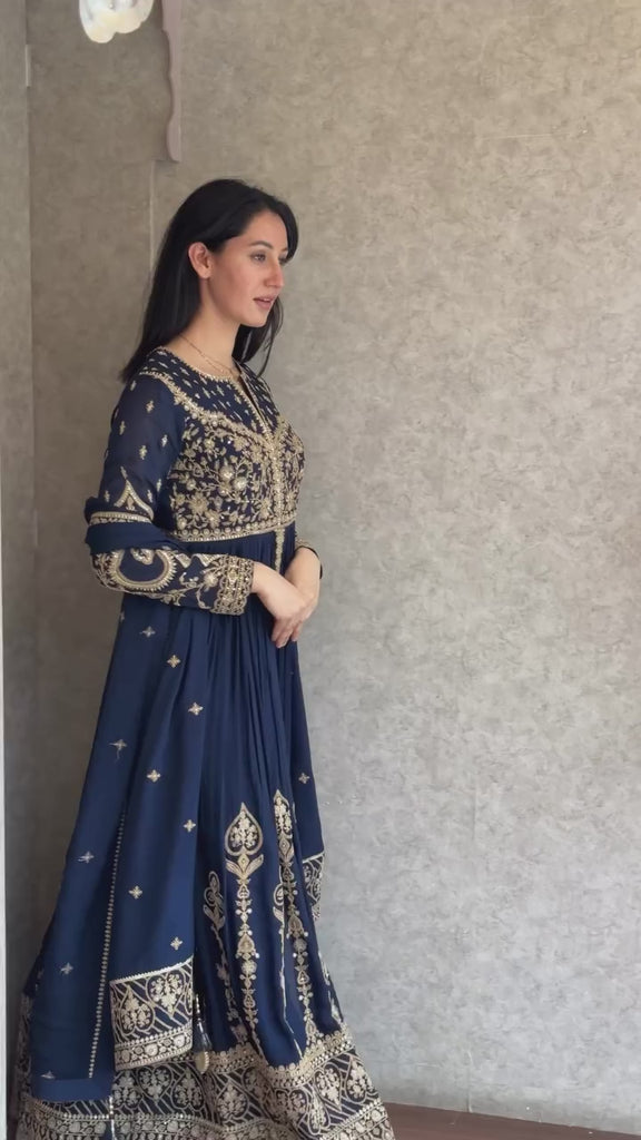 Step into the spotlight with this stunning Anarkali gown, a masterpiece of elegance and design. Crafted from sumptuous, high-quality Faux Georgette fabric with Heavy Embroidery on Neckline and Sleeves . This gown offers a rich, smooth drape and a luxurious feel that is perfect for any grand occasion.