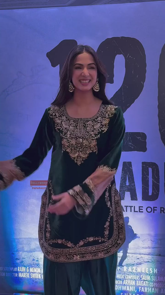 Embrace winter elegance with this stunning Dark Green Velvet Kurta Set. The short kurta is richly detailed with intricate Embroidery and Sequin work across the yoke, hem, and sleeve cuffs, offering a regal and opulent feel. Paired with coordinating silk blend bottoms, this ensemble is perfect for formal winter events