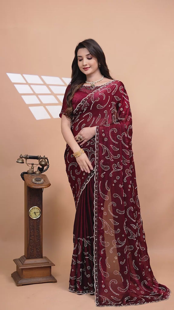 Drape yourself in elegance with this Maroon Colour, showcasing a beautiful Booty Pattern, intricately detailed with sparkling Jarkan work. The sheer elegance of the fabric combined with the sparkling embellishments ensures a truly glamorous look