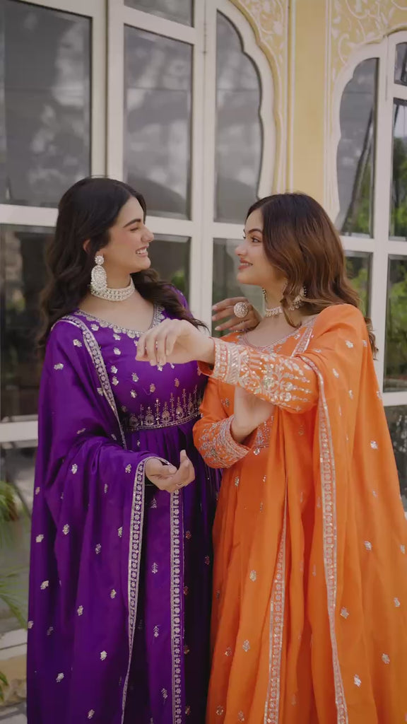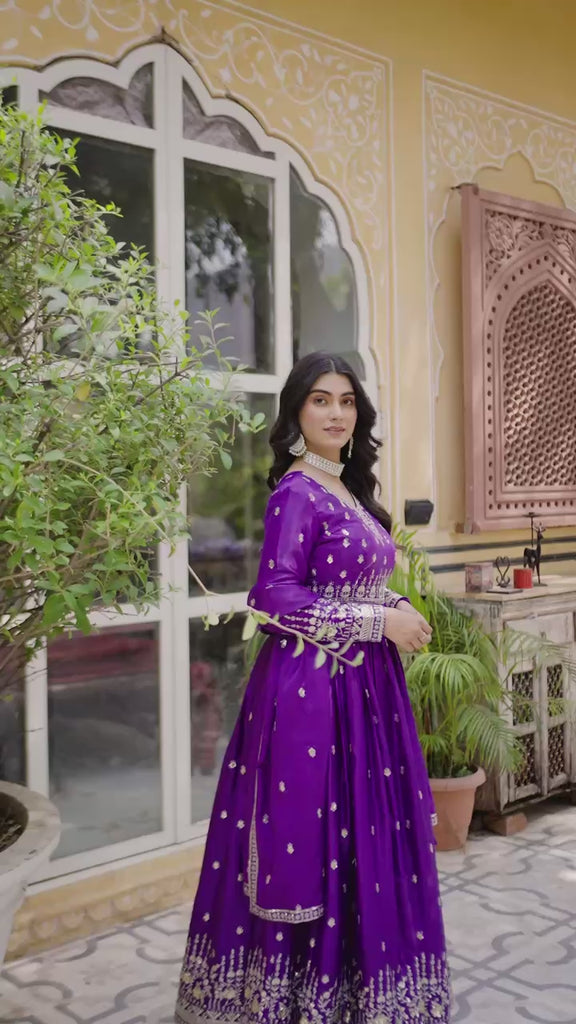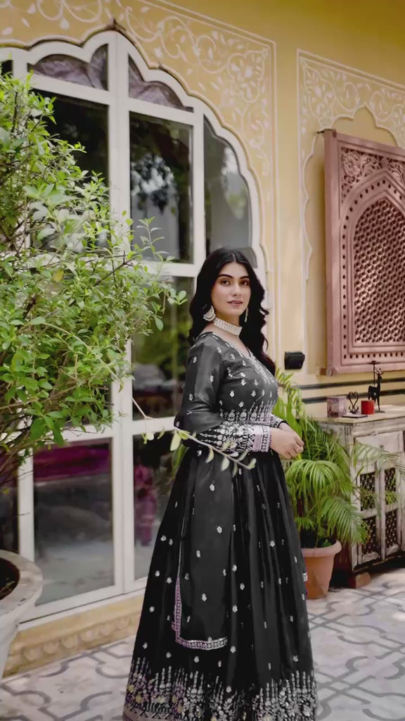 This Elegant Anarkali Gown Is Crafted In Lustrous American Silk And Enhanced With Intricate Thread And Sequin Embroidery For A Richly Detailed Finish. Paired With A Fully Stitched Pant And A Matching Embroidered Dupatta, It Is An Ideal Choice For Festive Celebrations, Weddings, And Special Occasions.